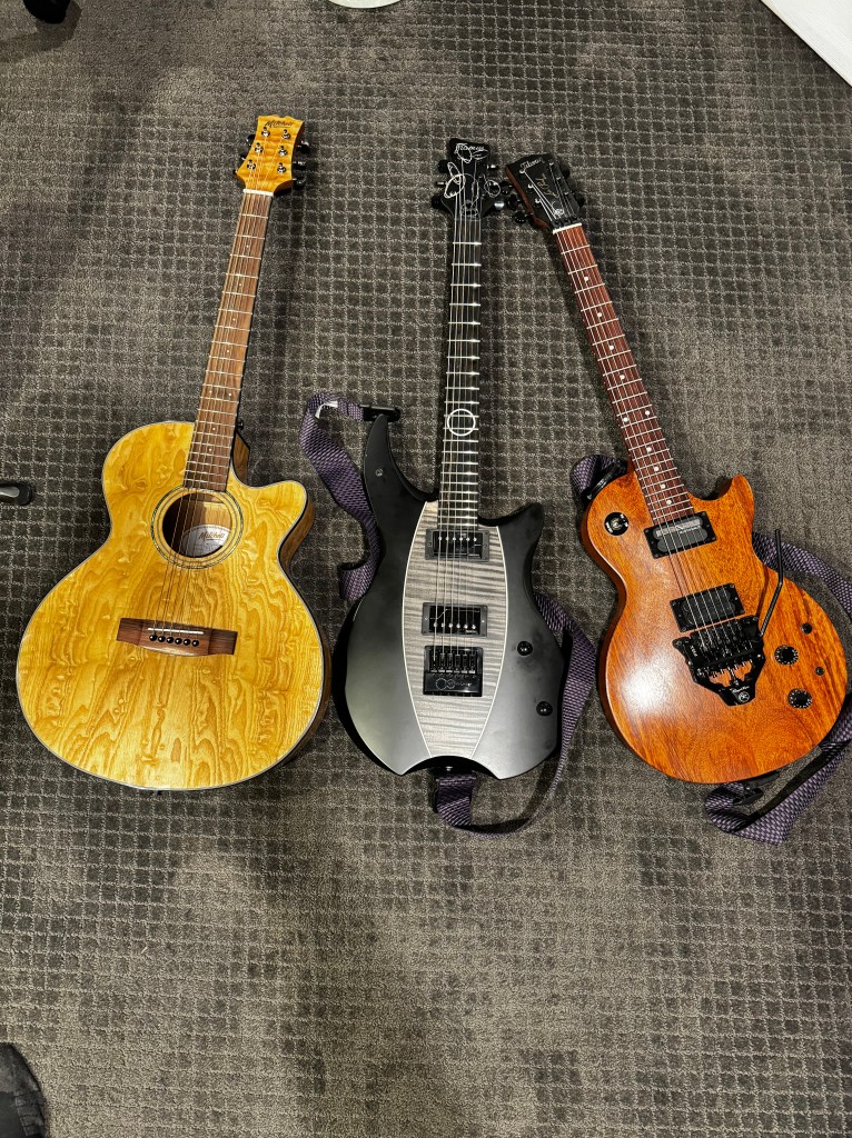 Gibson Les Paul Smart Wood Studio – with a bunch of modifications I had made, Framus Stormbender, Mitchell Acoustic (All Open C)